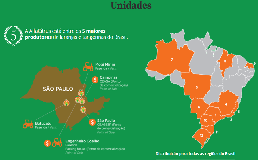 Com uma infraestrutura distribuída por 1.600 hectares, que conta com as fazendas de Botucatu, Engenheiro Coelho e Mogi Mirim, localizadas no interior de São Paulo, além do Packing House, e a dedicação de 500 trabalhadores, são hoje uma das 5 maiores produtoras e embaladoras de laranjas e tangerinas do país.